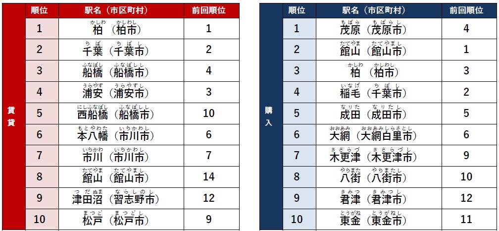 購入1位は「茂原」駅で、前回4位からランクアップしました。駅周辺にはショッピングモールの「南総サンヴェルプラザ」や「三越」などがあり、買い物をするのに便利です。また、茂原公園内には2,000本以上の桜が植えられていて、「さくら名所100選の地」に選ばれました。
