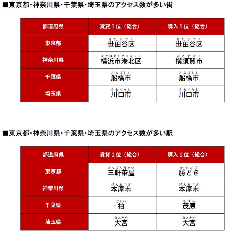 ≪東京都でアクセス数が多い駅(総合)≫賃貸1位「三軒茶屋」駅、購入1位「勝どき」駅