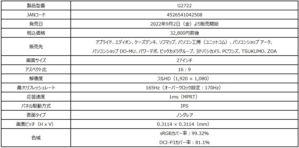 高画質で美しい映像を楽しめるIPSパネル搭載27インチゲーミングモニター リフレッシュレート170Hz・応答速度1msの高スペックモデル 「G2722」発売