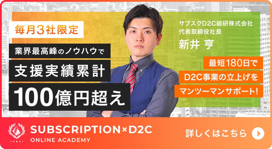 サブスクD2C総研株式会社(本社:東京都豊島区池袋、代表取締役社長:新井亨)では、毎月3社限定でD2Cの立上げ支援希望者の募集を開始致しました。お気軽にご応募ください。