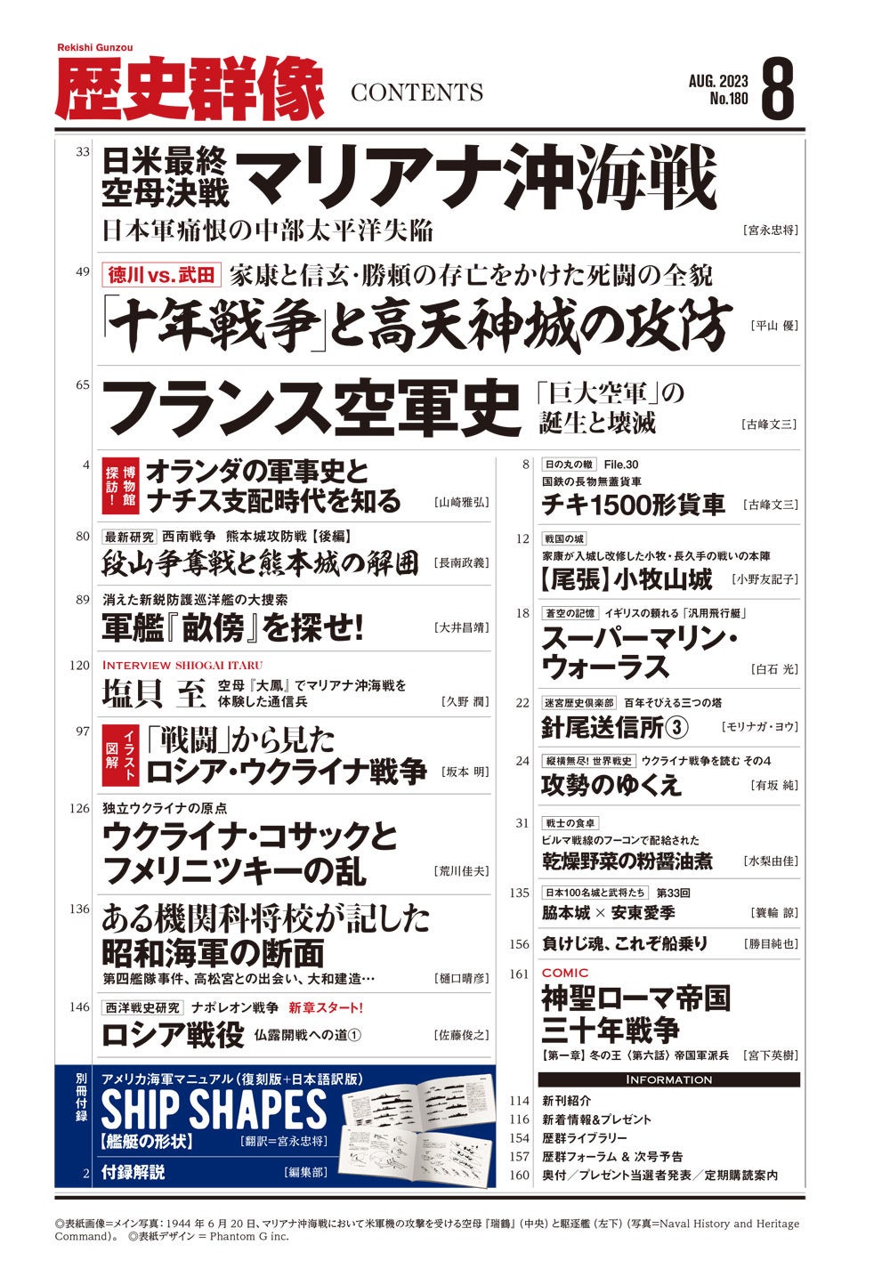 株式会社 ワン・パブリッシング(東京都台東区/代表取締役社長:廣瀬有二)は『歴史群像8月号』を発売いたしました。本号では別冊付録に、米海軍の「軍艦の見分け方」マニュアルとその日本語訳版を合本にした冊子が付いています。特集は「日米最終空母決戦・マリアナ沖海戦」「徳川vs武田『十年戦争』と高天神城の攻防」「フランス空軍史」の3本。ほかにも歴史、戦史ファン必読の記事多数を掲載しています。