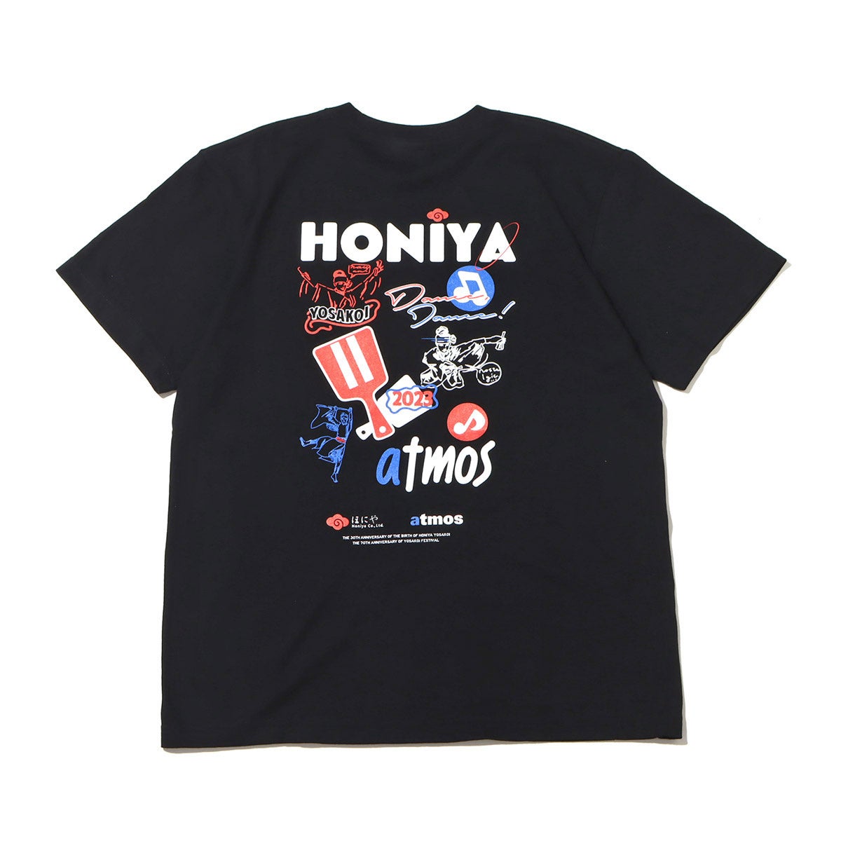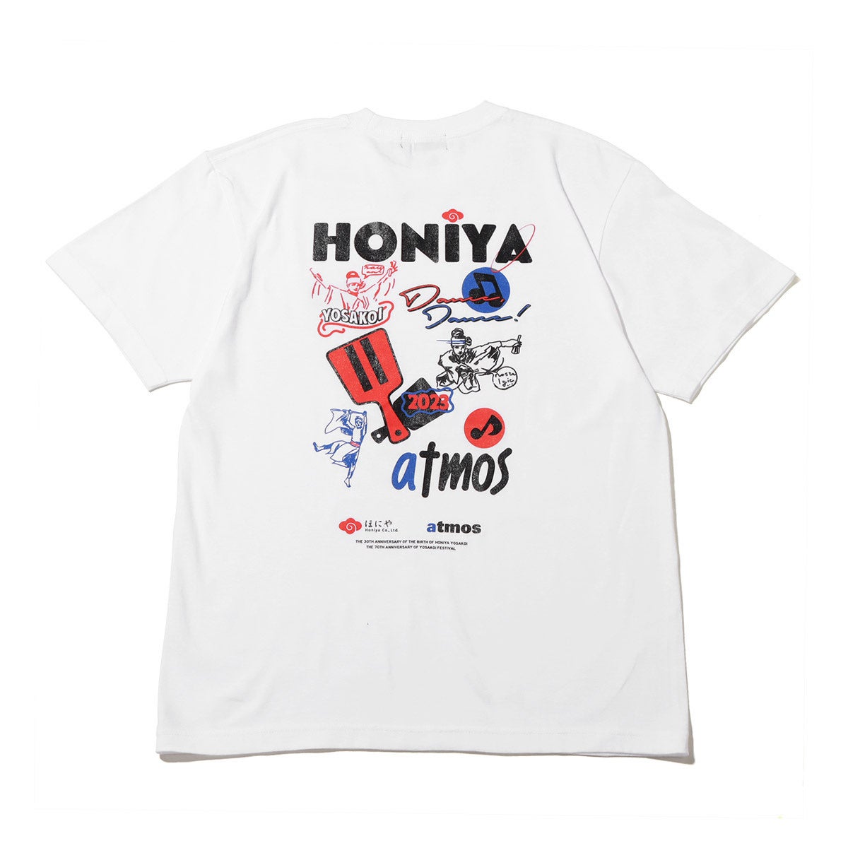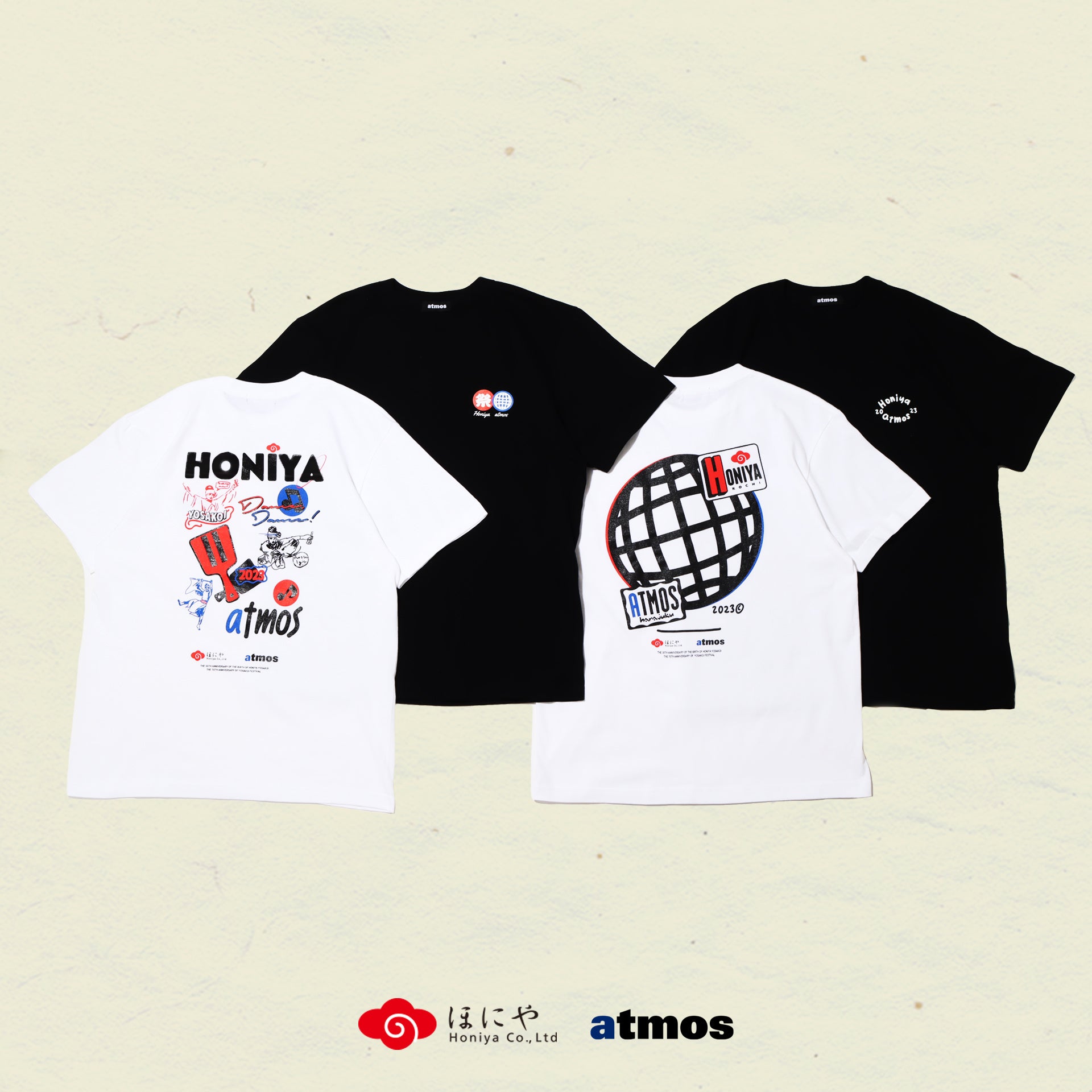 よさこい祭りは高知市内9カ所の競演場・7ヶ所の演舞場で約200チーム、約18,000人の踊り子が手に持った鳴子を鳴らしながら工夫を凝らし、地方車には華やかな飾り付けをして市内を乱舞する土佐の祭り。よさこいチームの中でも最多の9回大賞を受賞しているチーム「ほにや」とタッグを組み、「ほにや」と「atmos」のコラボレーションTシャツが4年ぶりに登場。