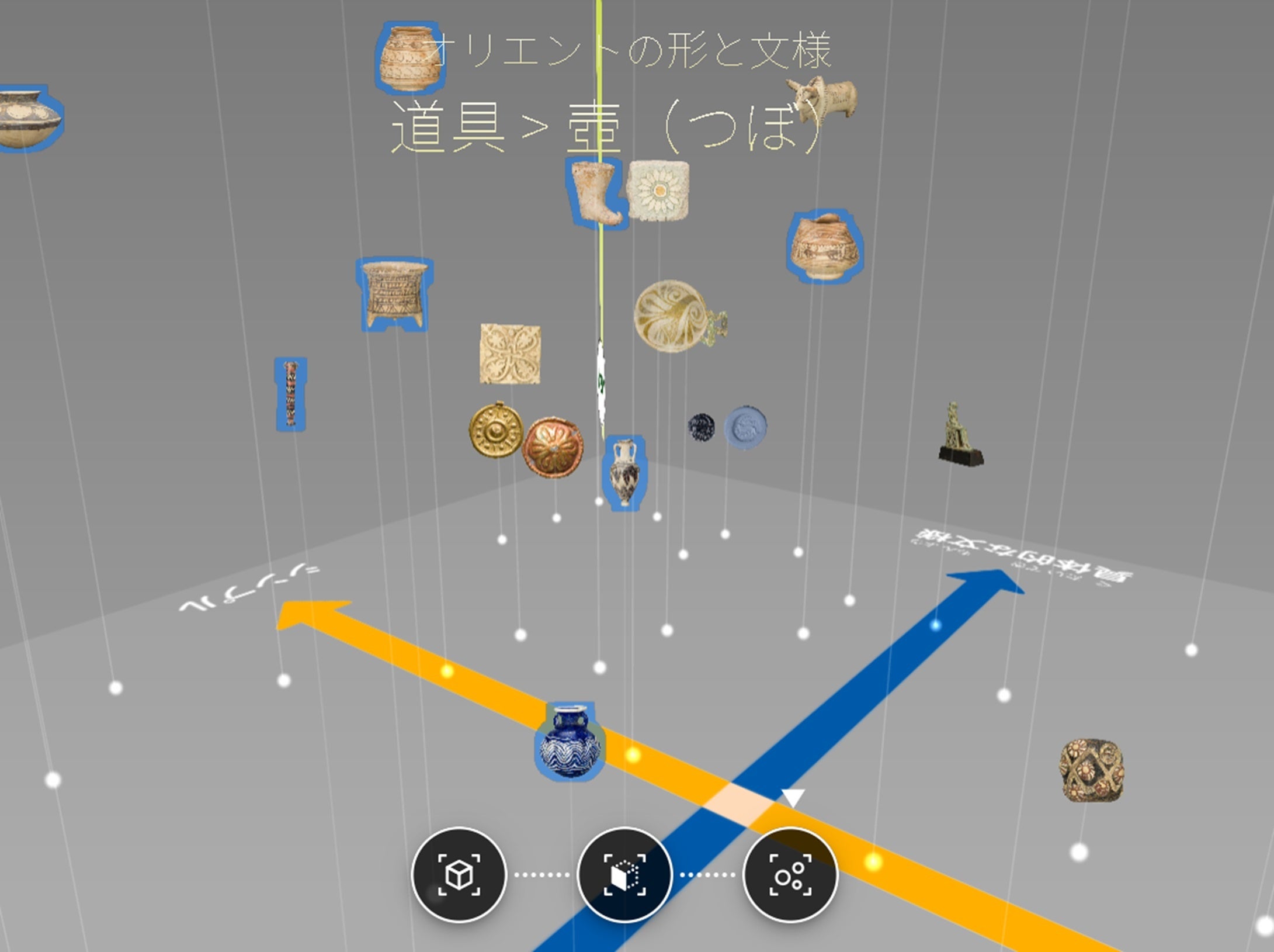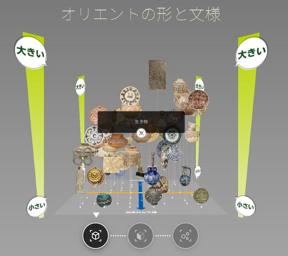 「みどころキューブ」には、岡山市立オリエント美術館の収蔵品のうち特徴的な文様の50点を格納します。立方体の縦軸を大きさ、底面を文様の特徴、側面を関連するモチーフとして設定し、子どもたちが興味のある収蔵品を直観的に探し、興味が広がるデザインにしました。子どもたちは、作品の詳しい解説を閲覧したり、解説欄で文様の拡大画像を観たり、「I.B.MUSEUM SaaS」の個別ページへアクセスしてさらに詳しい情報を閲覧したりできます。