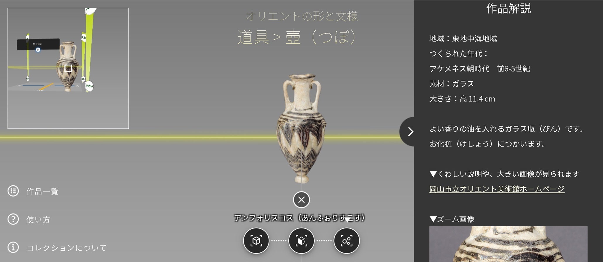 教育現場におけるICT教材のニーズの高まりを受け、2023年1月に、「みどころキューブ」を使用する実証実験*3を実際の教育現場で行い、その結果や効果が学術論文として「デジタルアーカイブ学会誌 2024, Vol.8, No.1」にて発表されました*4。こうした実績も活かして今回、岡山市内の小学校の授業でこの鑑賞システムを広く使用します。また、岡山市立オリエント美術館は早稲田システム開発株式会社が運営している収蔵品管理システム「I.B.MUSEUM SaaS」を導入しており、このシステムに連動する*5とともに、収蔵品をより魅力的に可視化するツールとして「みどころキューブ」を活用します。