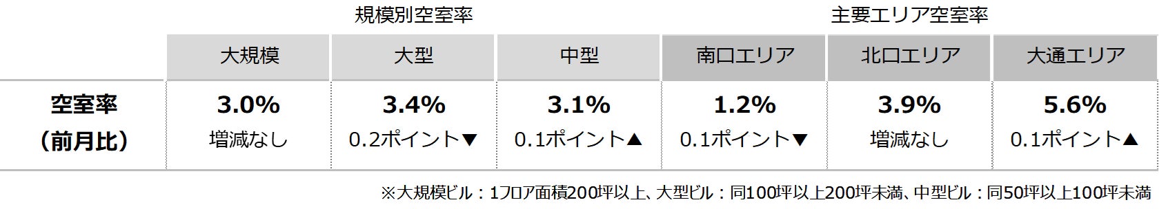 空室率は前月比マイナス0.02ポイントの3.14%と、前月からほぼ横ばいとなった。市内での集約移転等により空室が生じた一方、分室開設や一時需要で空室消化が進み、わずかな動きに止まっている。潜在空室率は前月比マイナス0.13ポイントの4.52%だった。