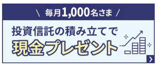 また、「投資信託の積み立てプラン」で1万円以上ご購入のお客さまの中から毎月抽選で1,000名さまに、現金1,000円をプレゼントしています。給与振り込み、またはおまかせ入金サービスをあわせてご利用のお客さまは、当選確率がアップします。