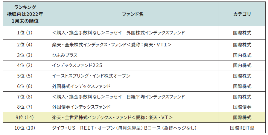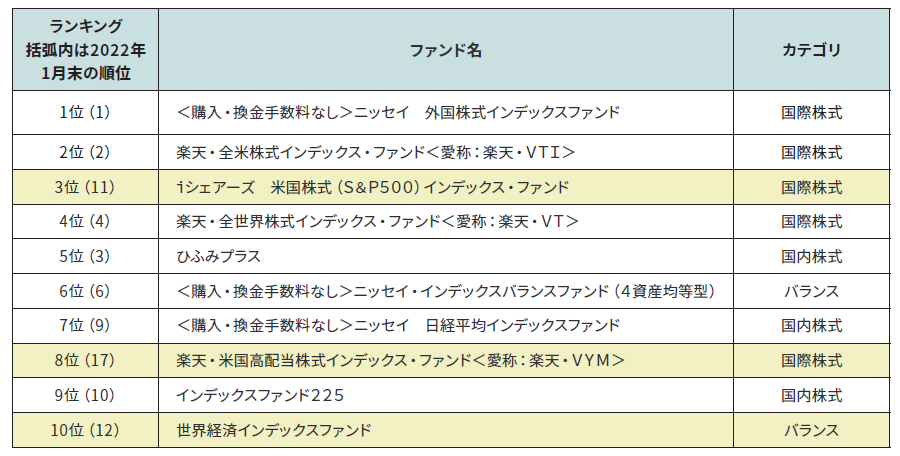 為替動向や長期投資の視点から、米国・世界経済に投資するファンドのランキングが上昇。2022年1月末時点では上位10位圏外だったファンドが、投資信託残高別ファンドランキングで1本、積み立てプランファンド購入金額別ランキングでは3本が上位10位以内に。
