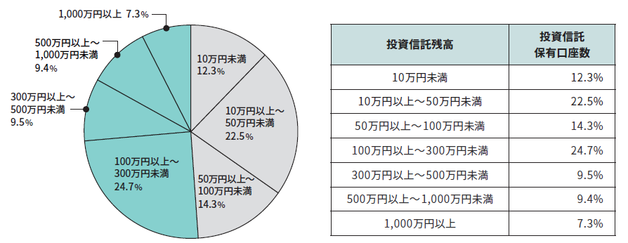 投資信託残高は100万円~300万円未満のかたが最も多く24.7%、100万円以上のかたは50.8%を占める結果になりました。