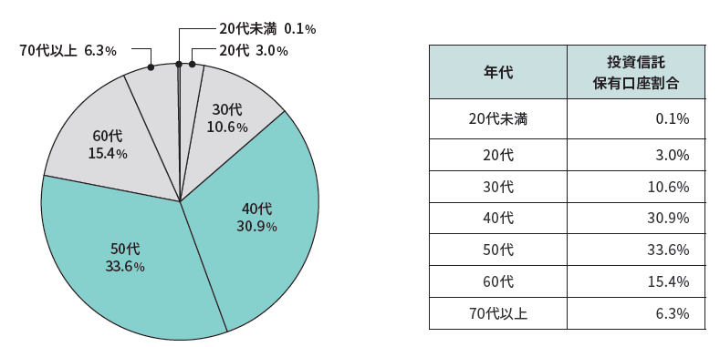投資信託を保有しているかたにおいて、40代・50代のかたが65%を占め、投資信託を余裕資金の運用手段としてご利用しているかたが多いことがうかがえます。