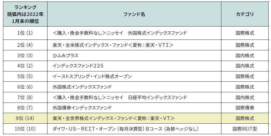 ・ 為替動向や長期投資の視点から、米国・世界経済に投資するファンドのランキングが上昇。2022年1月末時点では上位10位圏外だったファンドが、投資信託残高別ファンドランキングで1本、積み立てプランファンド購入金額別ランキングでは3本が上位10位以内に。