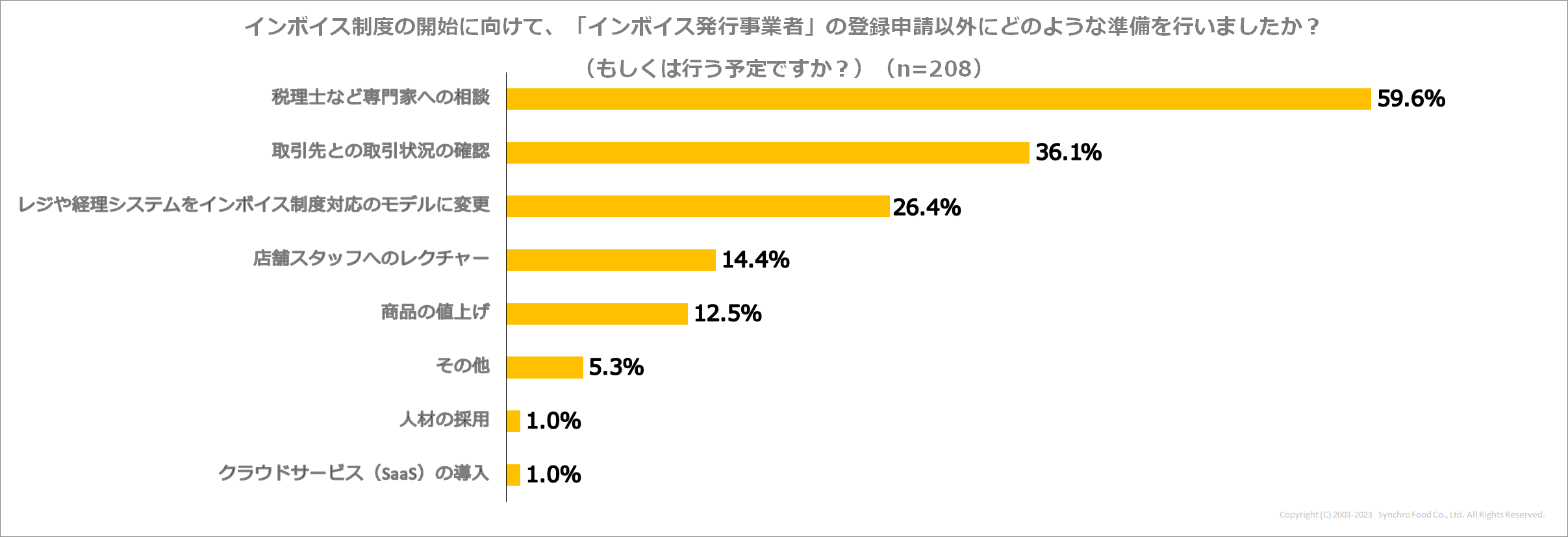次に、インボイス制度の準備を始めている店舗(=すでに準備を終えている、5割以上は準備を終えている、準備を始めたところ)に、インボイス発行事業者の登録申請以外に行った準備を尋ねました。すると、最も多かったのは「税理士など専門家への相談」との回答で59.6%。次いで、「取引先との取引状況の確認(36.1%)」、「レジや経理システムをインボイス制度対応のモデルに変更(26.4%)」との回答が続きます。