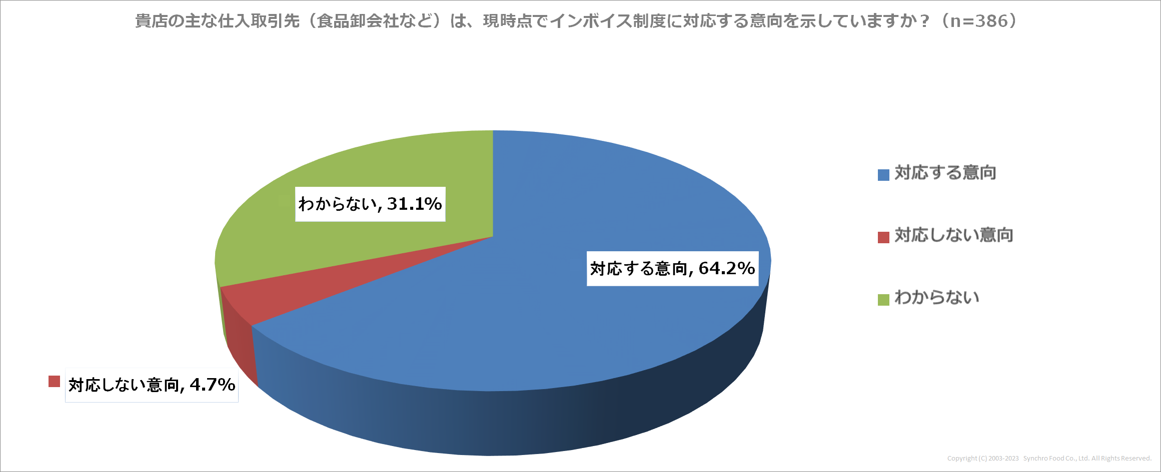 続いて、食品卸会社など主な仕入取引先がインボイス制度への対応意向を示しているか質問をしました。すると、64.2%が「対応する意向」と回答。一方で、「わからない」とする店舗も31.1%見られ、取引先の対応状況を確認できていない店舗も一定数いることが明らかとなりました。