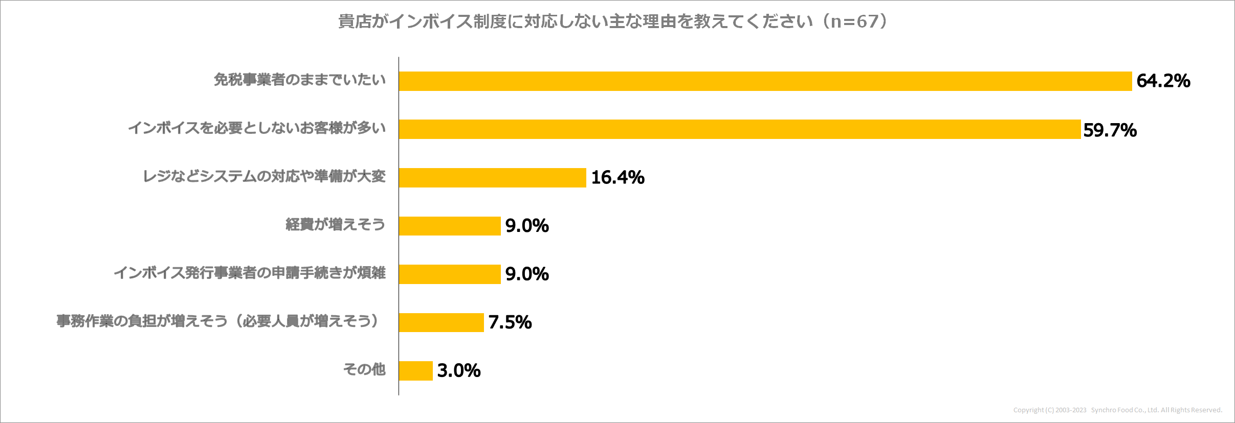 また、インボイス制度に「対応する予定はない」と回答した方に、その理由を教えてもらったところ、64.2%が「免税事業者のままでいたい(から)」との回答を選択。また、「インボイスを必要としないお客様(消費者や免税事業者)が多い」との回答も59.7%と目立っており、益税(消費税部分が利益になること)のメリットが高く、自店の客層のニーズが低いことが主な理由となるようです。