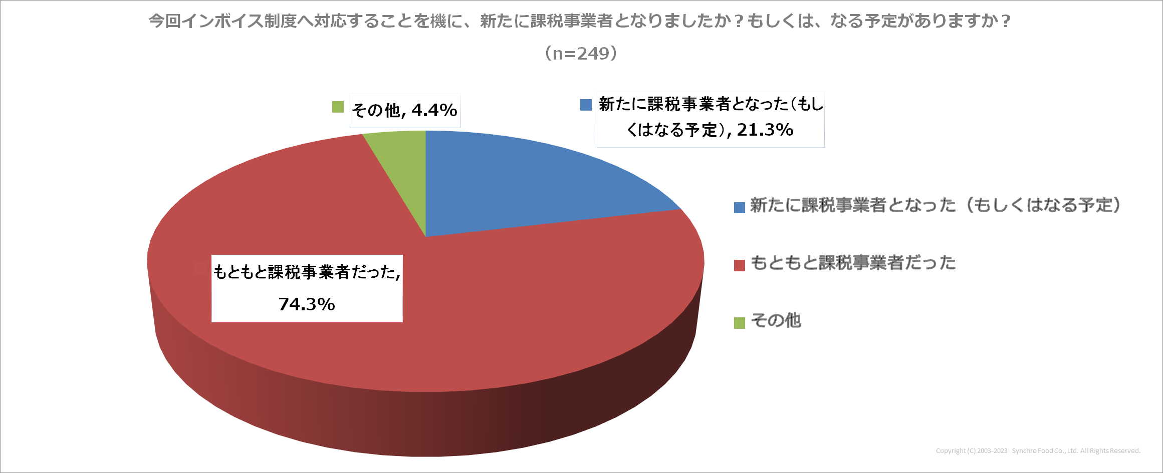 続いて、インボイス制度に対応予定の店舗に、インボイス制度への対応を機に、新たに課税事業者となる、もしくはその予定があるか尋ねました。すると、74.3%が「もともと課税事業者だった」と回答。「新たに課税事業者となった(もしくはなる予定)」との回答は21.3%で、インボイス制度対応予定の店舗のほとんどが、もともと課税事業者だったことが判明しました。