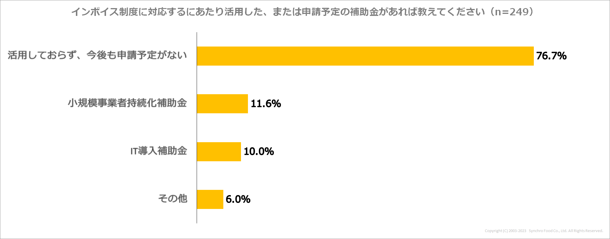 インボイス制度対応予定の店舗に、インボイス制度への対応に伴い活用した、または申請予定の補助金があるか質問したところ、最多は「活用しておらず、今後も申請予定がない」との回答で76.7%でした。補助金を活用している店舗は「IT導入補助金」が10.0%、「小規模事業者持続化補助金」が11.6%と、2割ほどにとどまりました。
