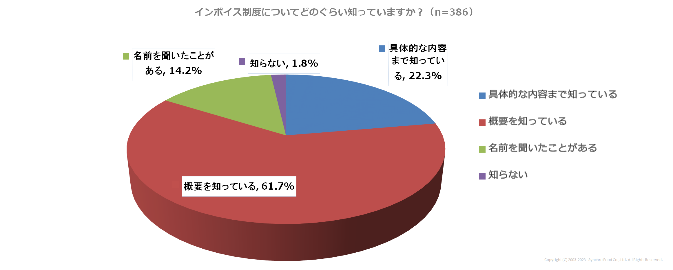 まず、インボイス制度への認知度を尋ねたところ、最も多かったのは「概要を知っている」との回答で61.7%。「具体的な内容まで知っている(22.3%)」との回答と合わせると、飲食店におけるインボイス制度の認知率は84%であることがわかります。