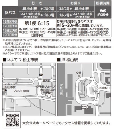 本年よりギャラリー駐車場のご用意を中止させていただいております。大変ご不便をおかけしますが、ご来場の際はいよてつ松山市駅及びJR松山駅発の無料シャトルバスをご利用ください。(所要時間約35分)