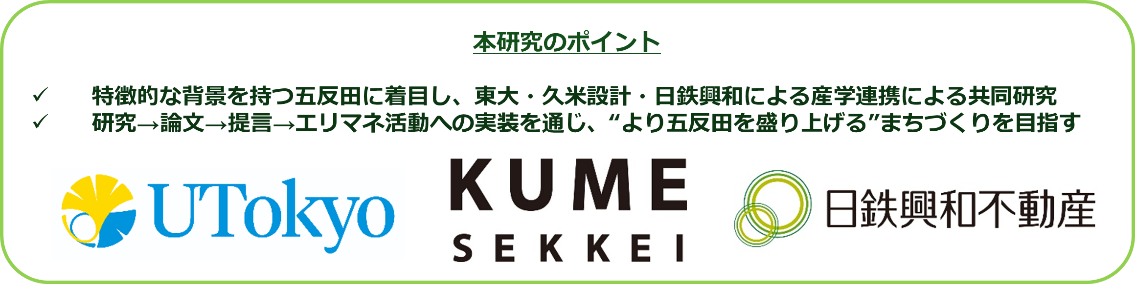 本研究を通じて、産学一体となって五反田地区における自律的・ボトムアップ型のイノベーション・ディストリクト形成の知見を蓄積するとともに、今後の都市開発やエリアマネジメント、スタートアップ支援等に活かすことで持続可能なエリア価値の創出に貢献してまいります。