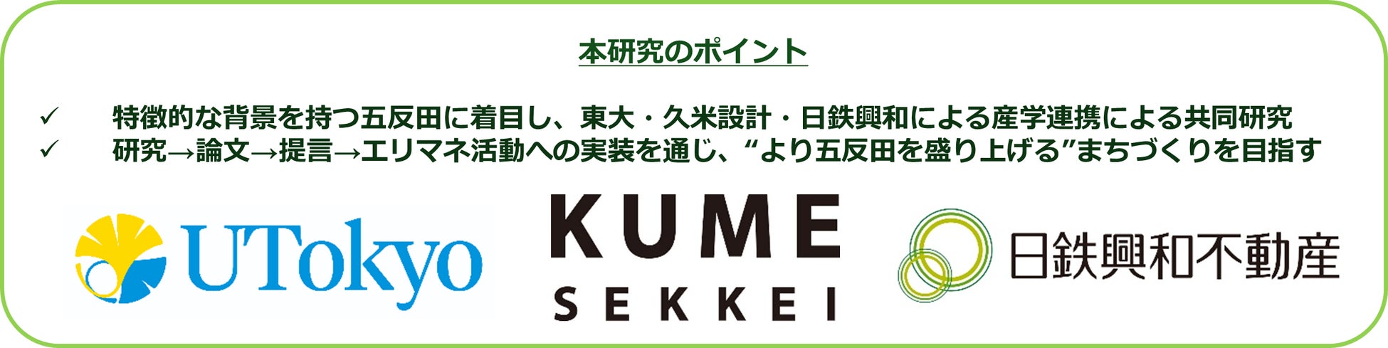 日鉄興和不動産株式会社(本社:東京都港区、代表取締役社長:三輪 正浩)は、東京大学大学院 新領域創成科学研究科 社会文化環境学専攻 空間計画研究室(教授:出口 敦)および株式会社久米設計(本社:東京都江東区、取締役社長:井上 宏)と共同で「五反田地区におけるイノベーション・ディストリクトの形成プロセスと生活圏のデザインに関する共同研究」を開始しましたのでお知らせいたします。