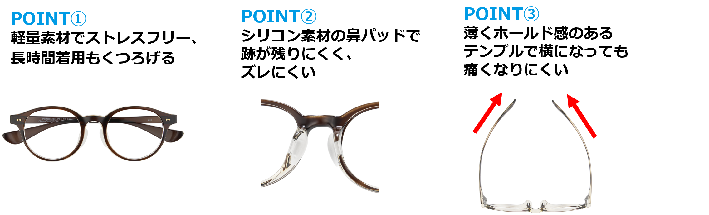 メガネの重さによる長時間着用の負担を少なくするため、素材は軽量プラスチックを使用。鼻パッドは鼻に跡が残りにくく、ズレにくいシリコンを採用し、テンプル(耳にかけるつる部分)は薄くホールド感のある構造で横になっても痛くなりにくい仕様に。