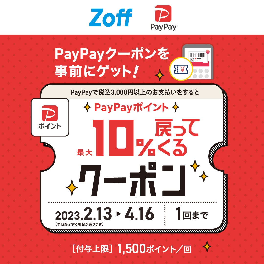 【内容】QRコード決済アプリ「PayPay」にて発行のZoffクーポンを取得し、お買い物時にPayPayでお支払いすると最大10%相当のPayPayポイントが戻ってきます。メガネの購入でポイントゲットのチャンス。