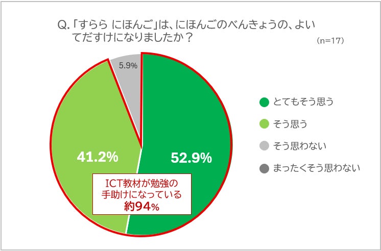 すららネットでは6月に、4月から日本語学習で「すらら にほんご」の活用を始めた生徒17人を対象に、アンケート調査を行いました。約88%の生徒が「すらら にほんご」の活用前と比べて日本語学習が楽しいと感じたと答えており、学習意欲が向上している様子がうかがえます。さらに、「すらら にほんご」を活用前と比べて授業がわかるようになったと答えた生徒は約90%、「すらら にほんご」は日本語学習の手助けになったと感じている生徒は約94%となり、たった2か月で早くも生徒たちが「すらら にほんご」による学習効果を実感していることがわかりました。