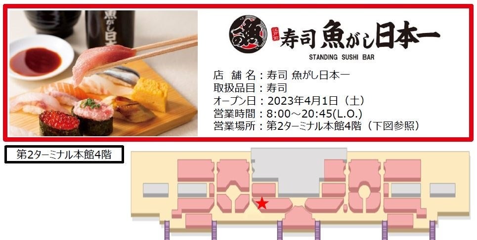 2023年4月1日(土)、成田空港第2ターミナル本館4階に成田空港初出店の「寿司 魚がし日本一」がオープンします。