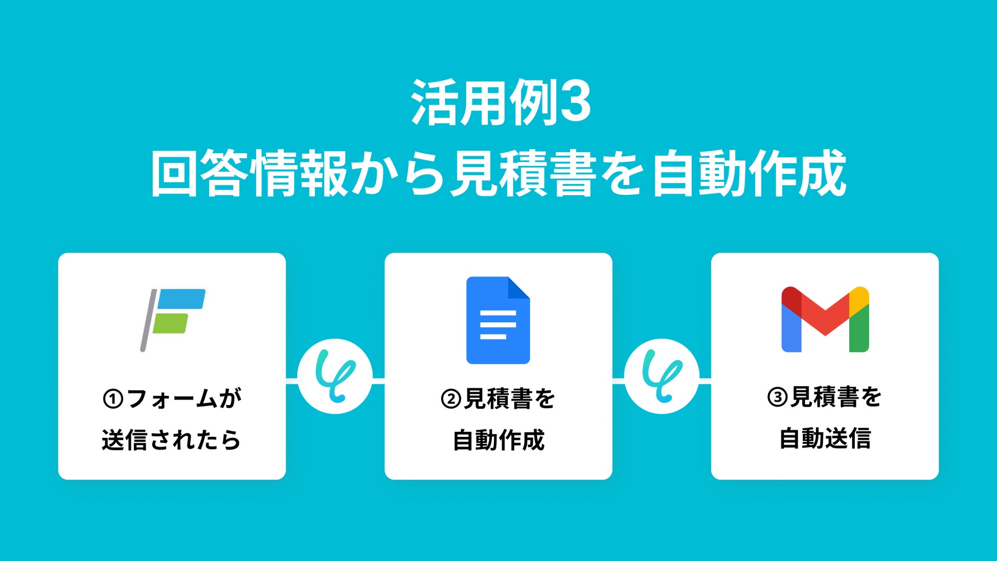 フォームの回答情報を活用してお使いの雛形で帳票を自動作成するフローです。契約書の作成→メール送信といった一連のフローをワンストップで自動化できます。