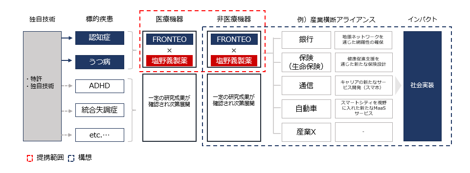 FRONTEOと塩野義製薬は、今回の提携により、FRONTEOの自然言語処理AI技術を活用し、両社で高性能な診断支援AIモデルおよび医療機器・非医療機器の開発と社会実装を目指すことによりまして、精神神経疾患における診断を効率化し、患者さまのQOL向上と医療関係者の負担軽減、医療資源の有効活用に貢献します。具体的な提携内容は次の通りです。