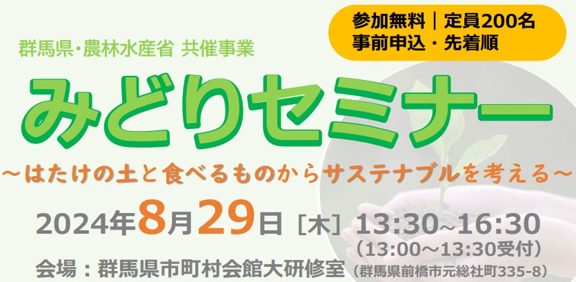 「みどりセミナー」は、群馬県と農林水産省の共催です。持続可能な生産と消費を目指す「みどりの食料システム戦略」推進のため、農業者や消費者をはじめ多様な立場の人たちに環境配慮型農業への理解を呼びかけます。