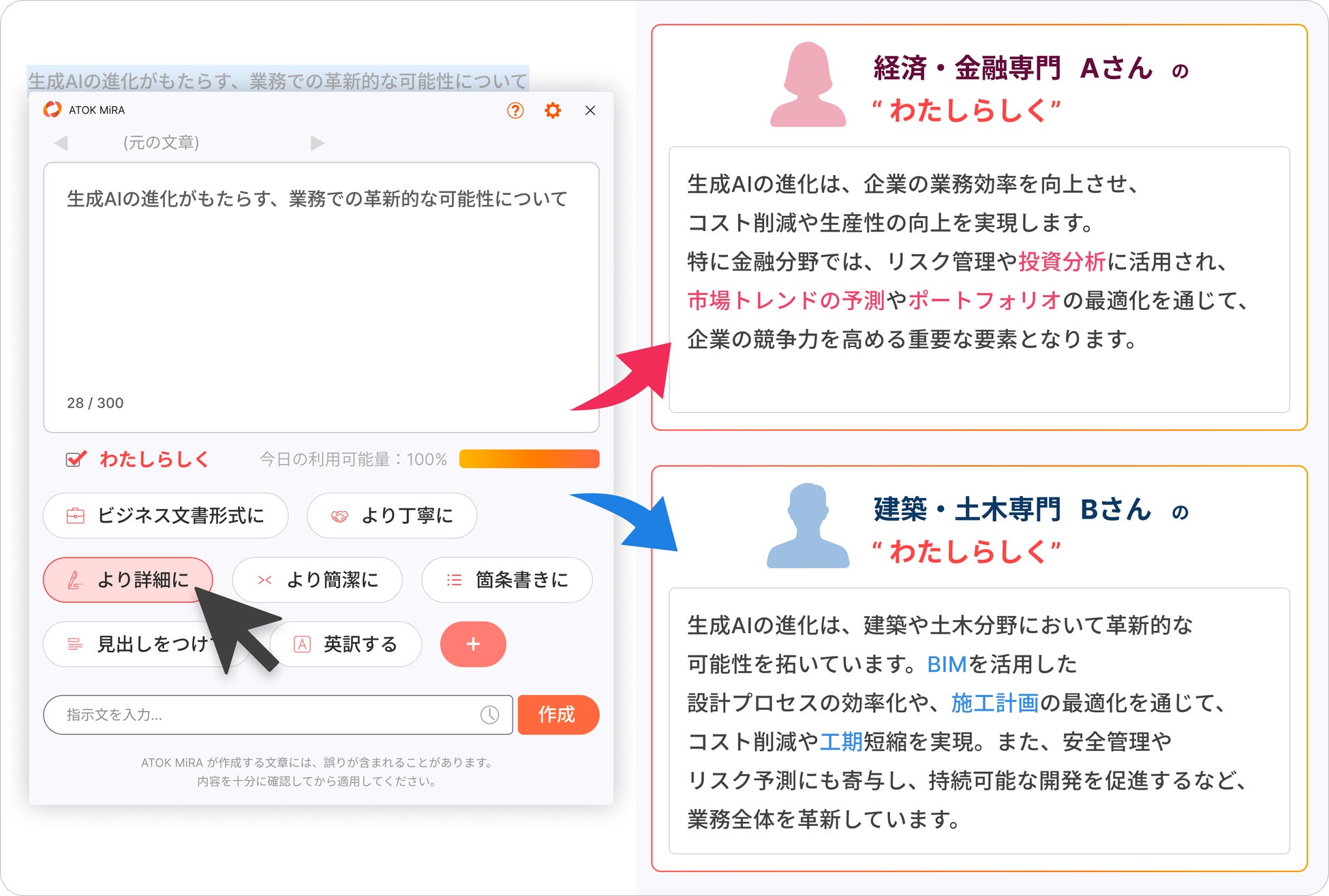 「ATOK MiRA(My Intelligent Rewrite Assistant)」は、ATOKの「日本語処理技術」と「個人の入力傾向・設定」に生成AIを組み合わせることで、“わたしらしい”文章を提案します。日本語入力中に表示されるアシストアイコンから「ATOK MiRA」を呼び出し、「ビジネス文章形式に」「より詳細に」といった定型指示を選択するだけで、誰でも手軽に文章の推敲、要約はもちろんのこと、アイデア出しや文章の書き換えまでを行えます。