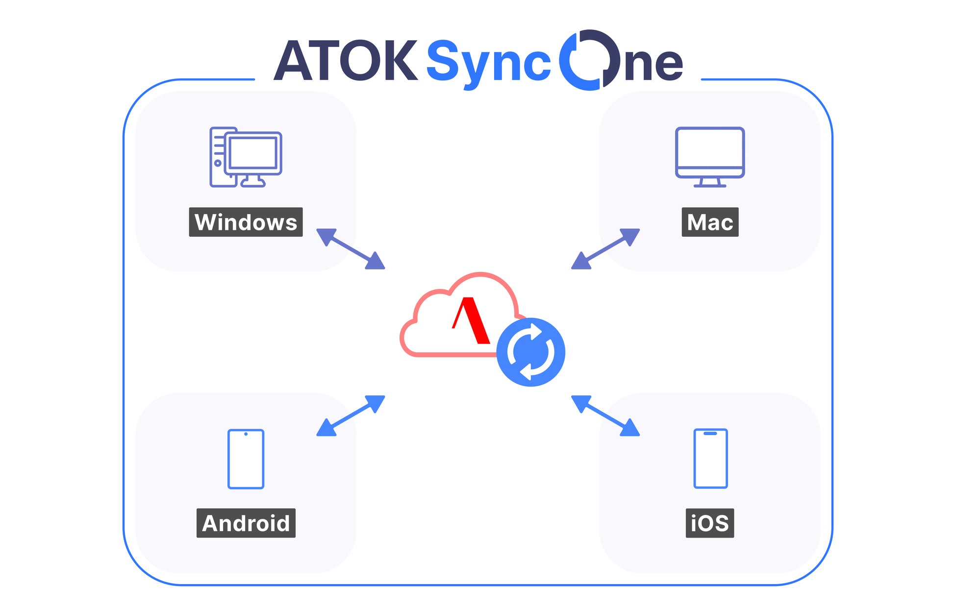 ATOK Syncは、変換辞書の学習情報、確定履歴、削除した単語など、ATOKの入力環境を複数端末間で同期できるクラウドサービスです。今回、Windows、Macに加え、Android、iOSでの同期を可能とした「ATOK Sync One」を提供します。どのデバイスからでも、使い慣れた環境で快適な入力が可能となります。