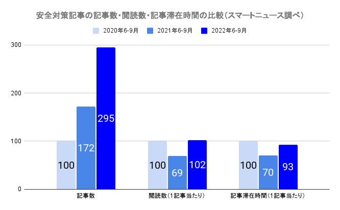 安全対策に関する記事の記事数は2年で3倍に増加の一方、閲読数は横ばい、滞在時間は微減。スマートニュースの閲読データ調査から