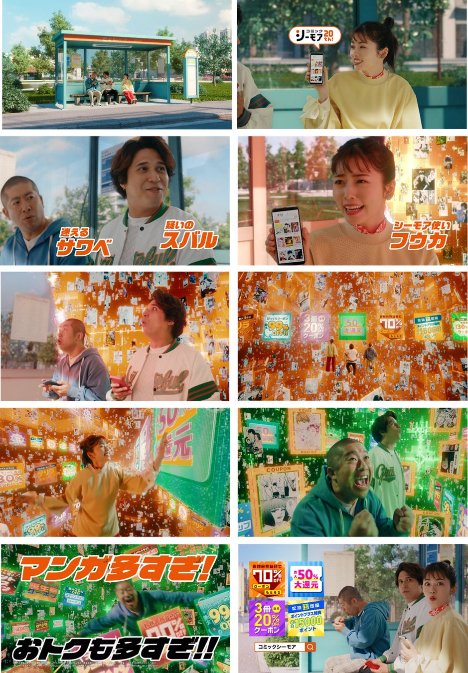 さらに、「3人のマンガ好き おトクも多すぎ」篇では、バス停を舞台にマンガってどこで買っても一緒でしょ?と疑う木村さんと澤部さんに対し、次は様々なクーポンやキャンペーンが広がる電脳空間へと小芝さんが誘い、コミックシーモアはおトクに読めるサービスが豊富であることを伝えます。