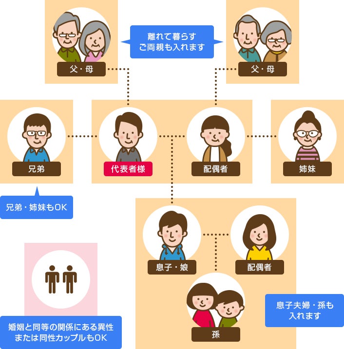 プレミアムプランに加入中の代表者様のご家族なら、1名につき月額1,980円でファミリープランに加入することができます。2親等までファミリープランをご利用いただけます。