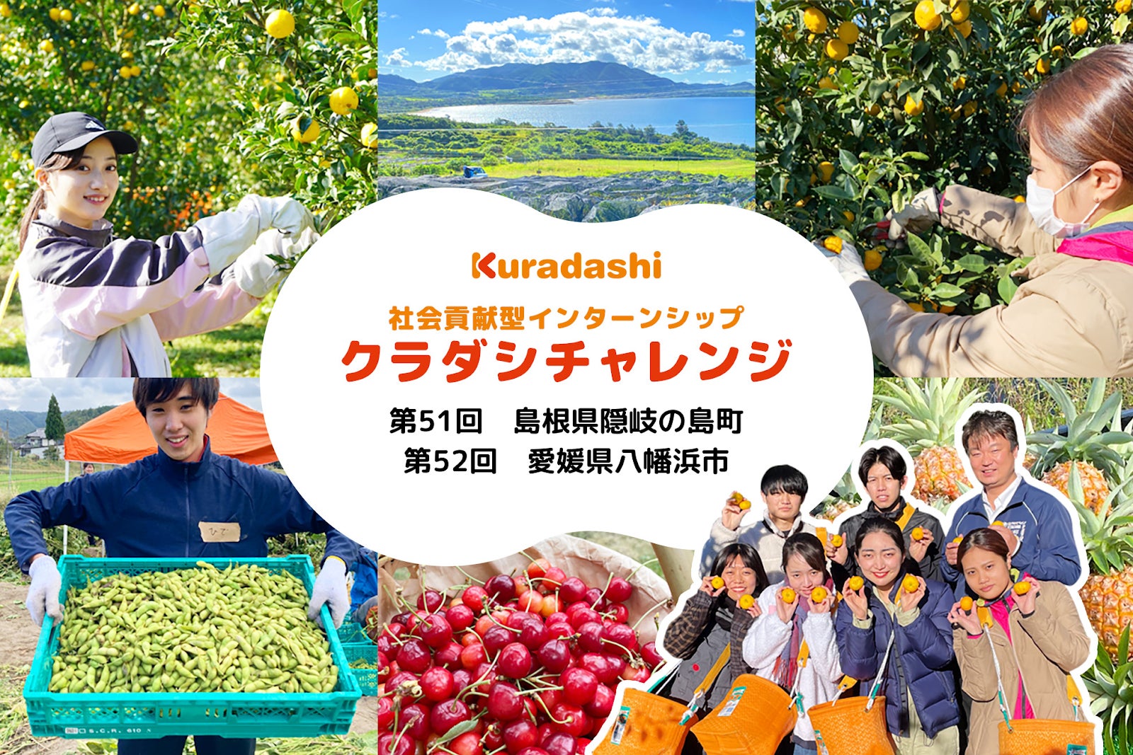 ソーシャルグッドマーケット「Kuradashi」を運営する株式会社クラダシ(本社:東京都品川区、代表取締役社長CEO:河村晃平、以下「クラダシ」)は、2025 年3月に島根県隠岐の島町・愛媛県八幡浜市で開催する社会貢献型インターンシップ「クラダシチャレンジ」の参加学生の募集を開始いたします。