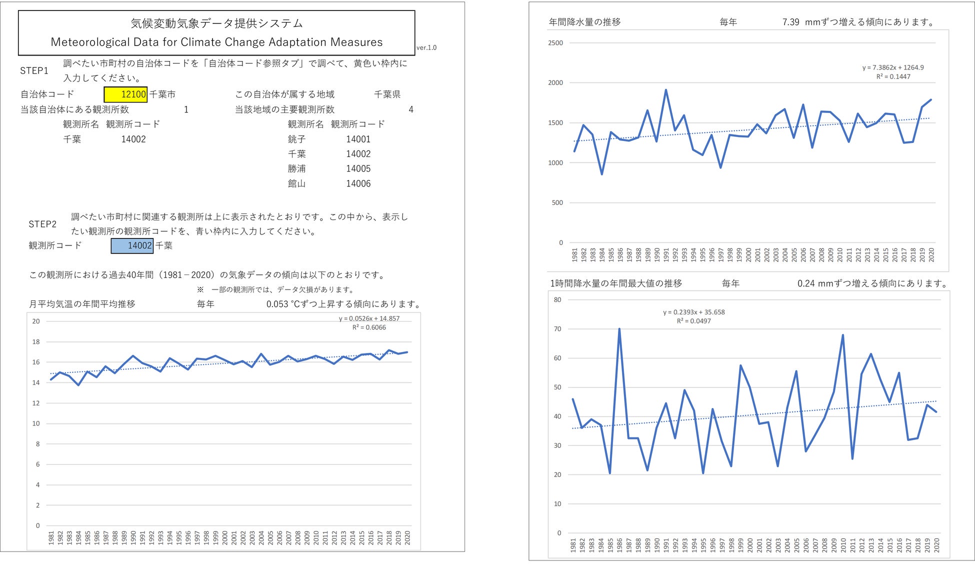 千葉⼤学⼤学院社会科学研究院 倉阪秀史教授らは、全国の主要観測所における過去40年間の気候変動の状態をグラフで参照できる「気候変動気象データ提供システム」を公開しました( https://opossum.jpn.org/news/2022/02/07/849/ )。地方自治体ごとに参照すべき観測所が調べられる仕様になっており、各自治体における地域気候変動適応計画のために利用できる資料となっています。どなたでも無料でダウンロードしてお使いいただけます。