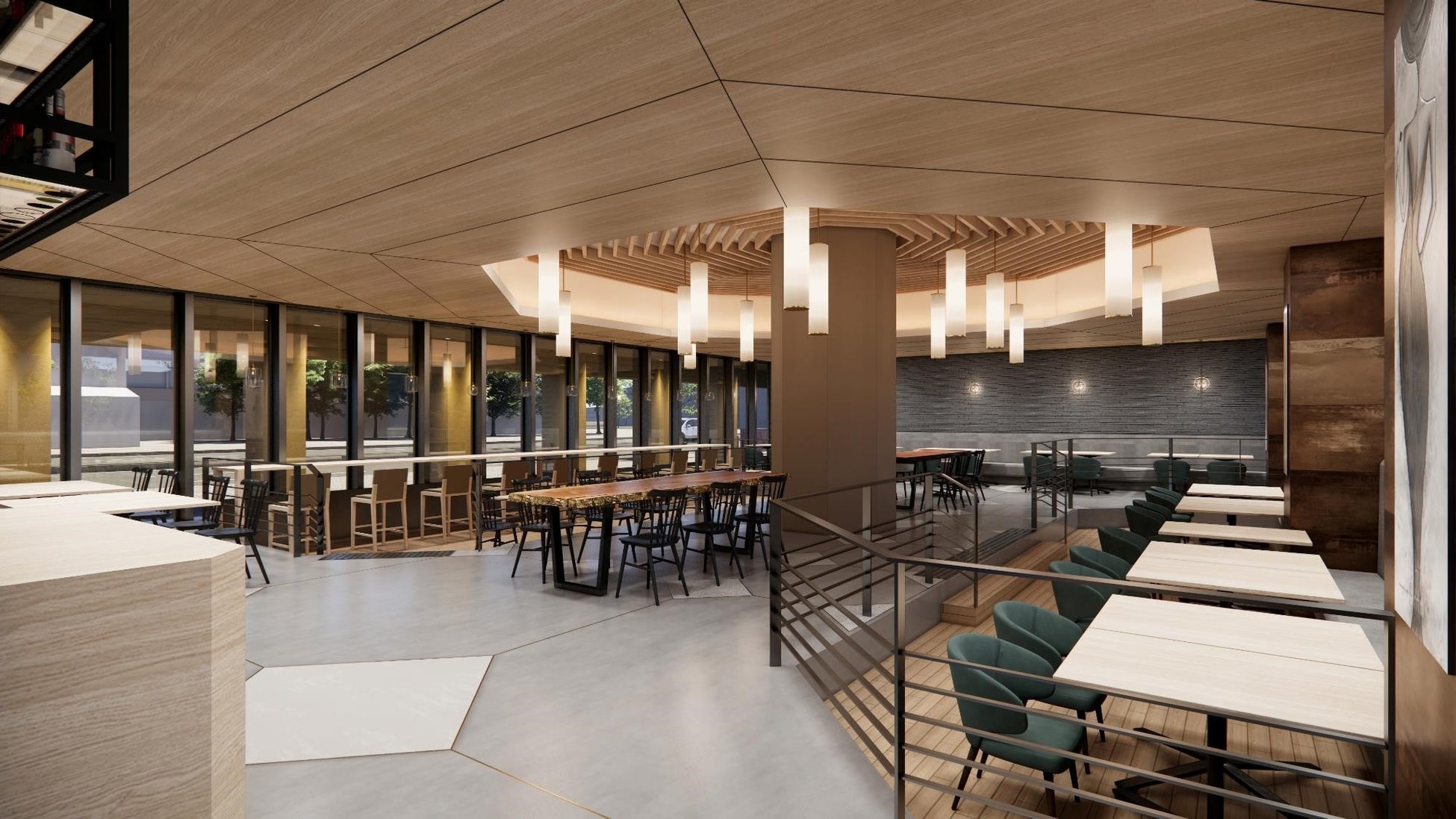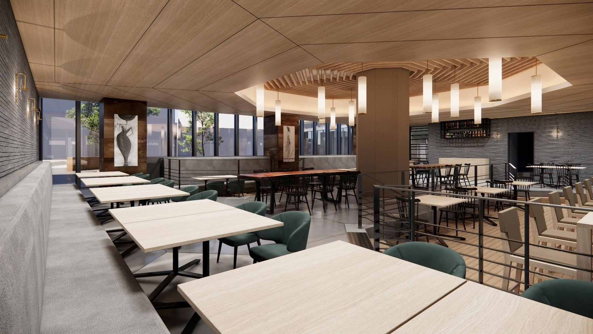 レストランは外からも目につきやすい1階に位置します。中央の八角形の柱を中心に客席が配置され、客席を一段下げることで中庭への視界が通り、明るく開放的なデザインで設計します。