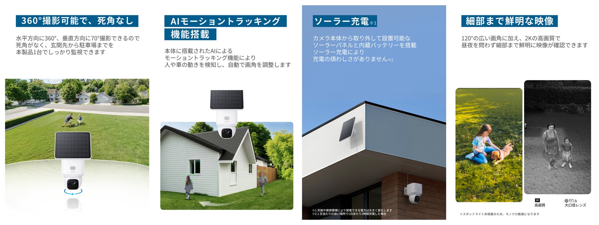 いずれの製品もソーラーパネルとバッテリーを搭載するため、面倒な充電や配線は不要(※2)で、簡単に設置できます。またAmazon.co.jpにてお買い求めいただく際は、初めて防犯カメラを設置する方にも安心な取り付けサービス(※3)を合わせてご購入いただくことができます。 Eufyはお客様の安心できる豊かな暮らしを後押しすべく、手軽に設置できるエントリーモデルから精緻な検知と撮影ができるハイエンドモデルまで、ラインナップを拡大して参ります。