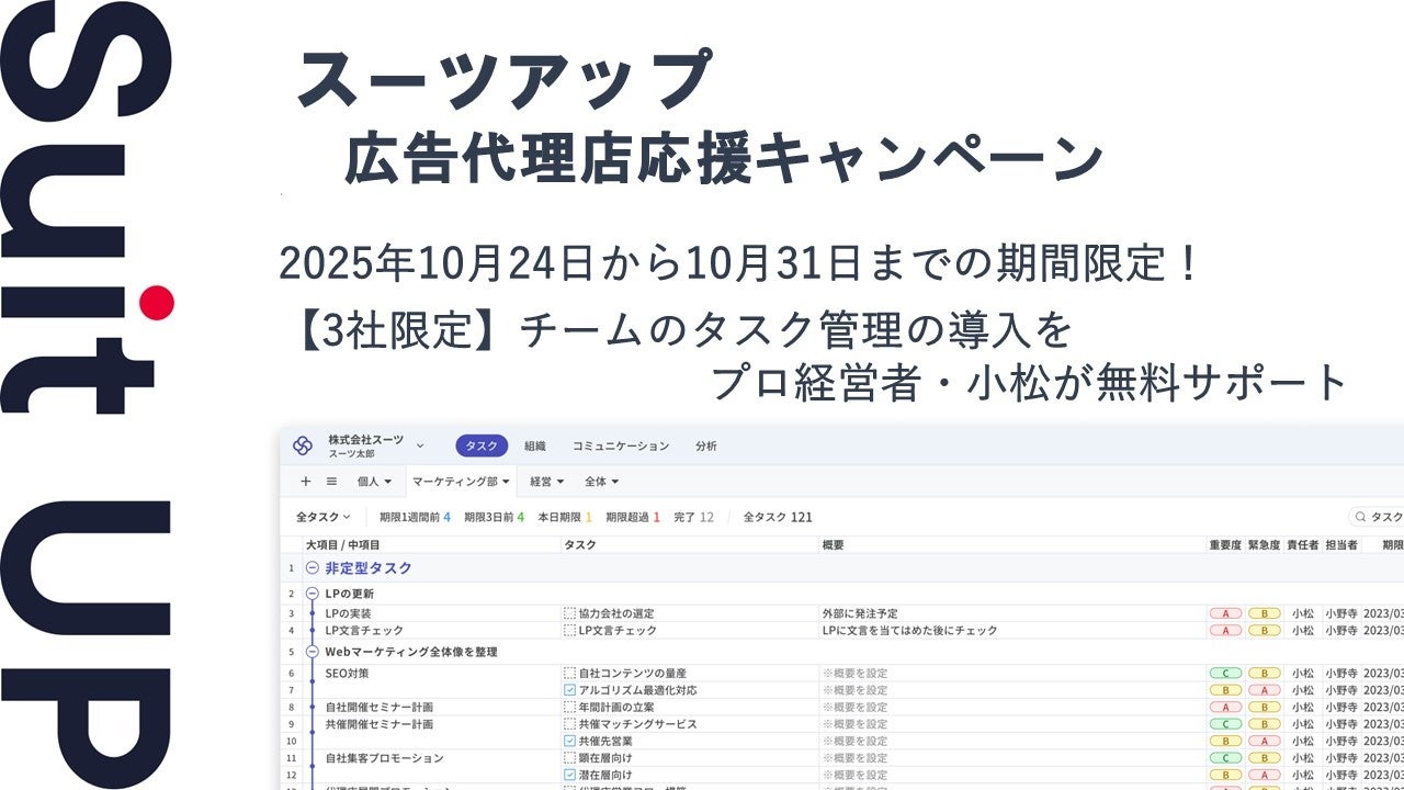 株式会社スーツ(所在地:東京都千代田区、代表取締役社長CEO:小松 裕介)は、チームのタスク管理・プロジェクト管理ツール「スーツアップ」において、広告代理店応援キャンペーンを実施いたします。