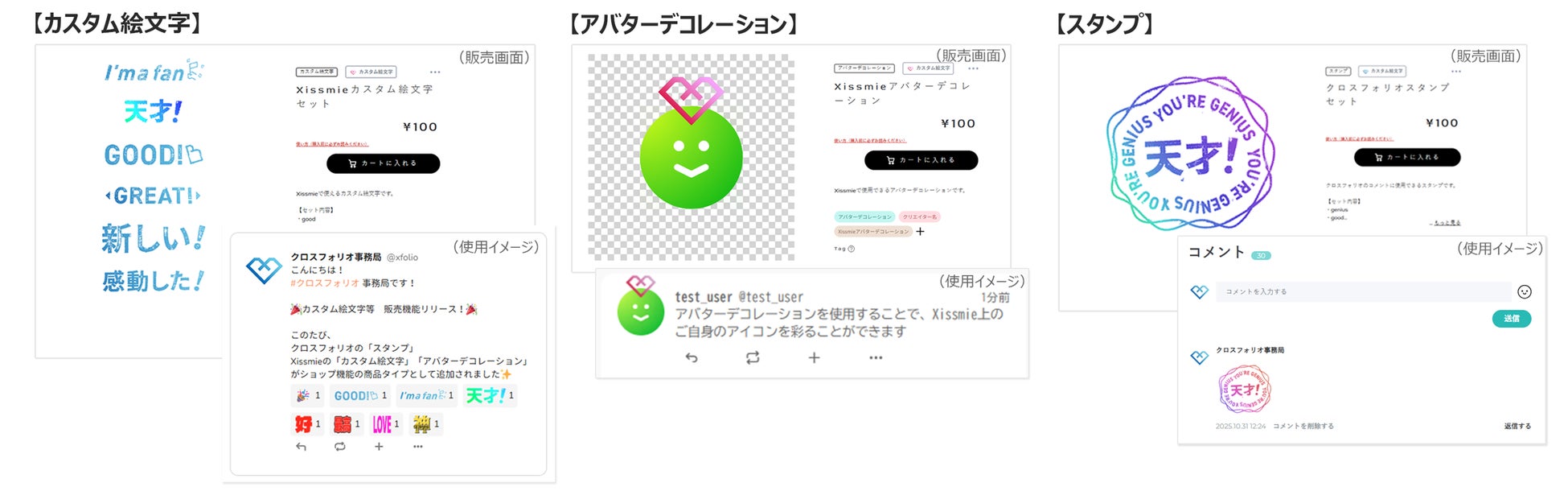 クロスフォリオのコメントに使える「スタンプ」や、Xissmieの「カスタム絵文字」は、これまで事務局が用意したものしかご利用いただけませんでしたが、このたび商品に追加されたことで、クリエイター自身がこれらの製作・販売をできるようになりました。またXissmie上で自身のアイコンを彩ることができる「アバターデコレーション」も販売することが可能です。