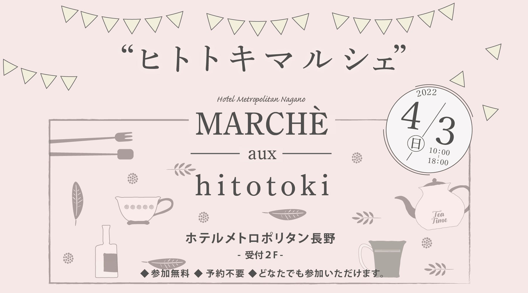 ホテルメトロポリタン長野(所在地:長野県長野市 代表者:代表取締役社長 山田幸秀)は、こだわりのティーラテと焼き立てスコーンを楽しみながらさまざまな癒し体験ができるイベント 「ヒトトキマルシェ」 を2022年4月3日(日)に開催する。