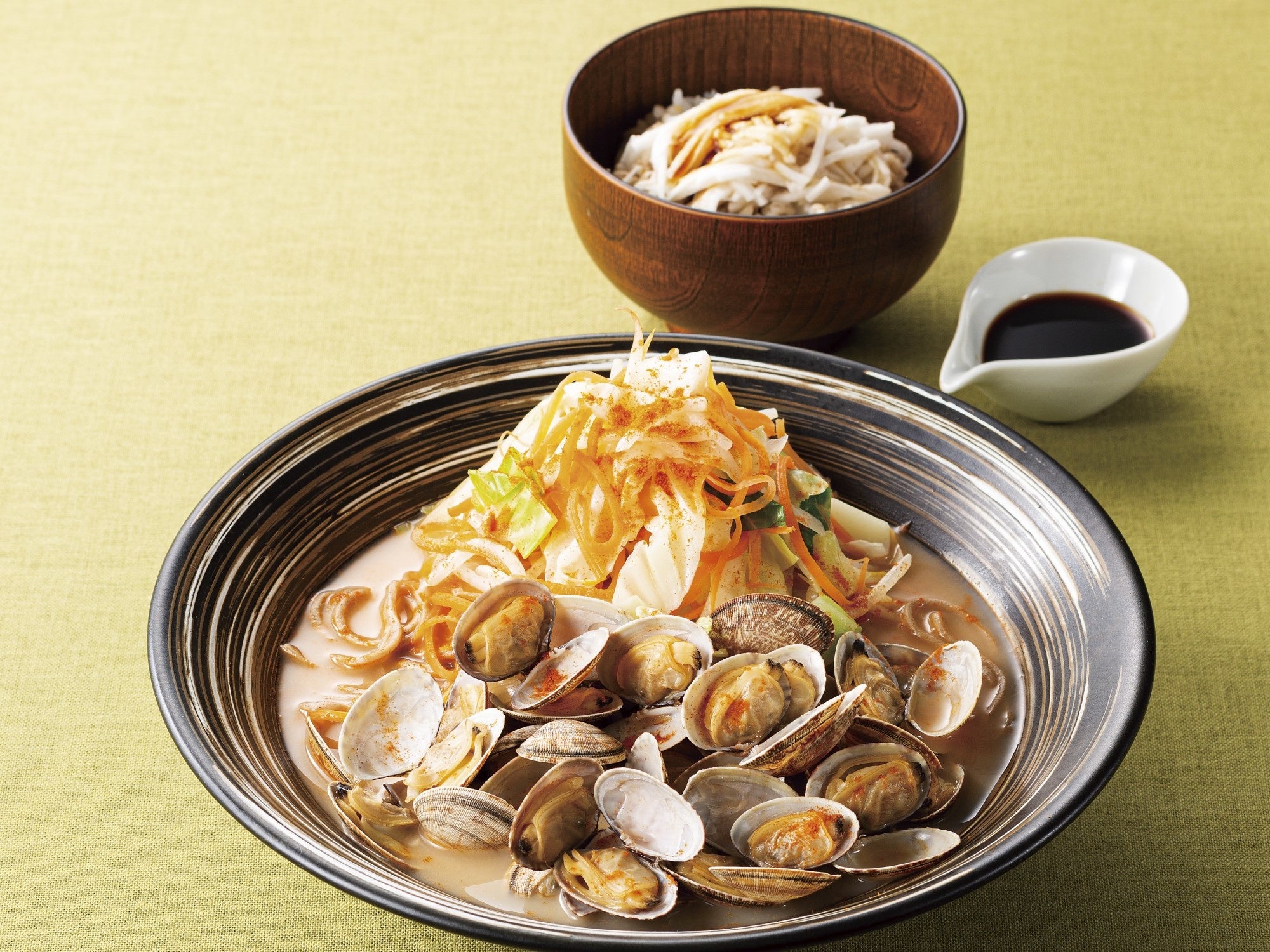 たっぷり250gのあさりに、きゃべつ/にんじん/たまねぎ/もやしをどっさり150g盛りつけ、ピリッと辛い旨辛ちゃんぽんスープで仕上げました。