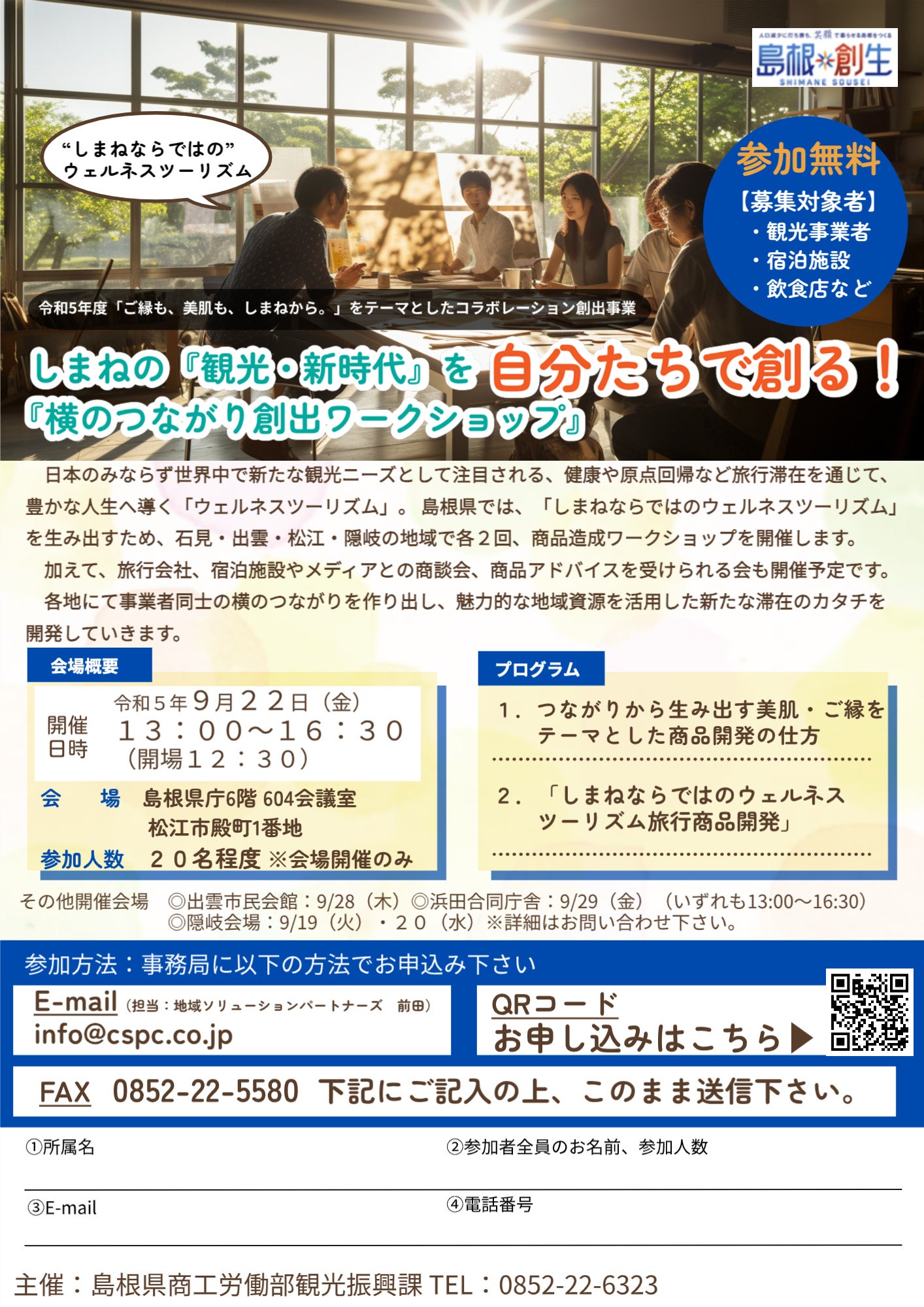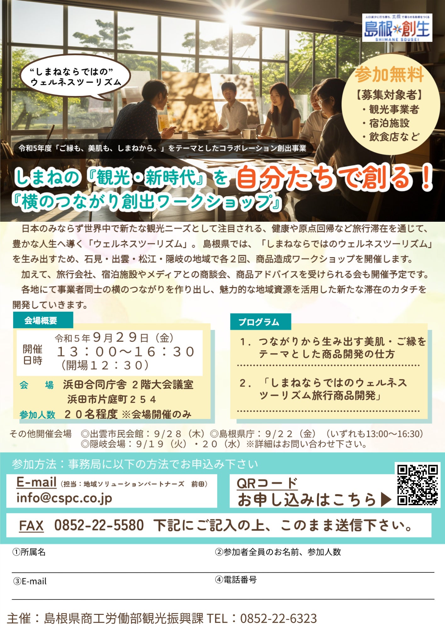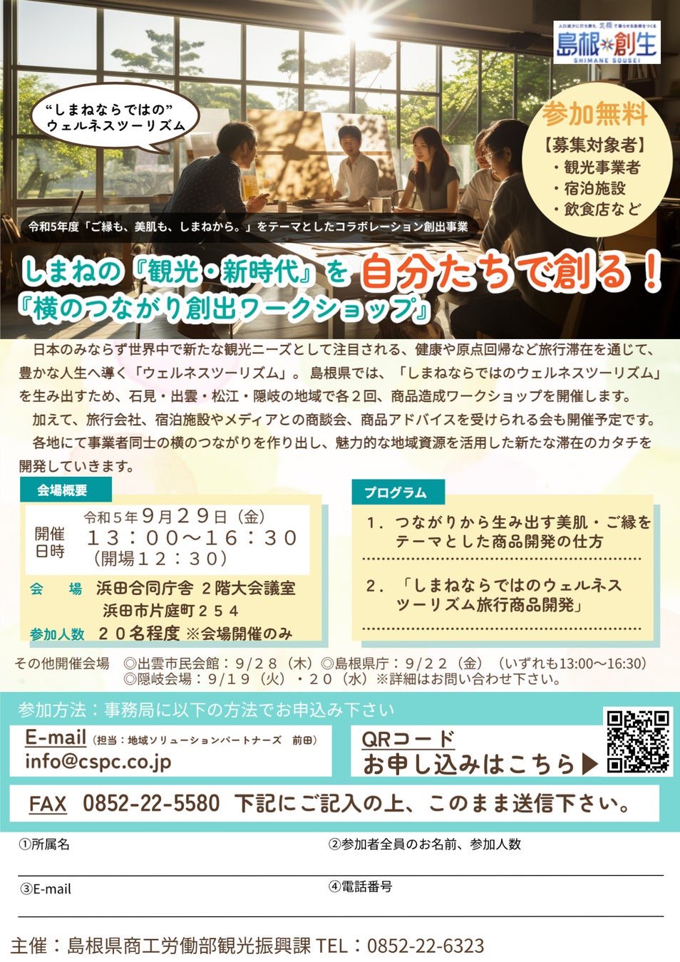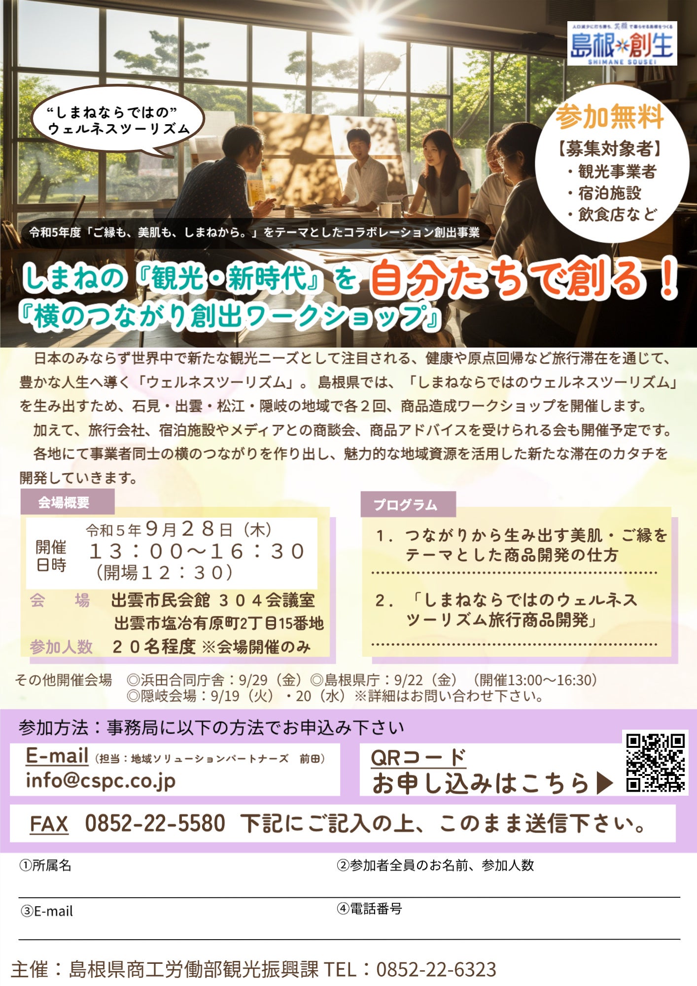 自然・人・地域とつながり、心と身体を癒す「ウェルネスツーリズム」は、日本のみならず世界中で新たな観光ニーズとして注目されています。島根県は、「ご縁も、美肌も、しまねから。」をテーマに、ウェルネスツーリズムに関心の高い旅行者に対して、魅力的な地域資源を活用した新たな滞在の形を提案するため、県内各地域で、観光事業者や宿泊施設、飲食店など向けに、以下の通り、第1回目のワークショップを開催します!10月以降に第2回目(松江・出雲・浜田予定)、1月には第3回目(県全体)のワークショップも開催予定です。たくさんのご参加お待ちしています。