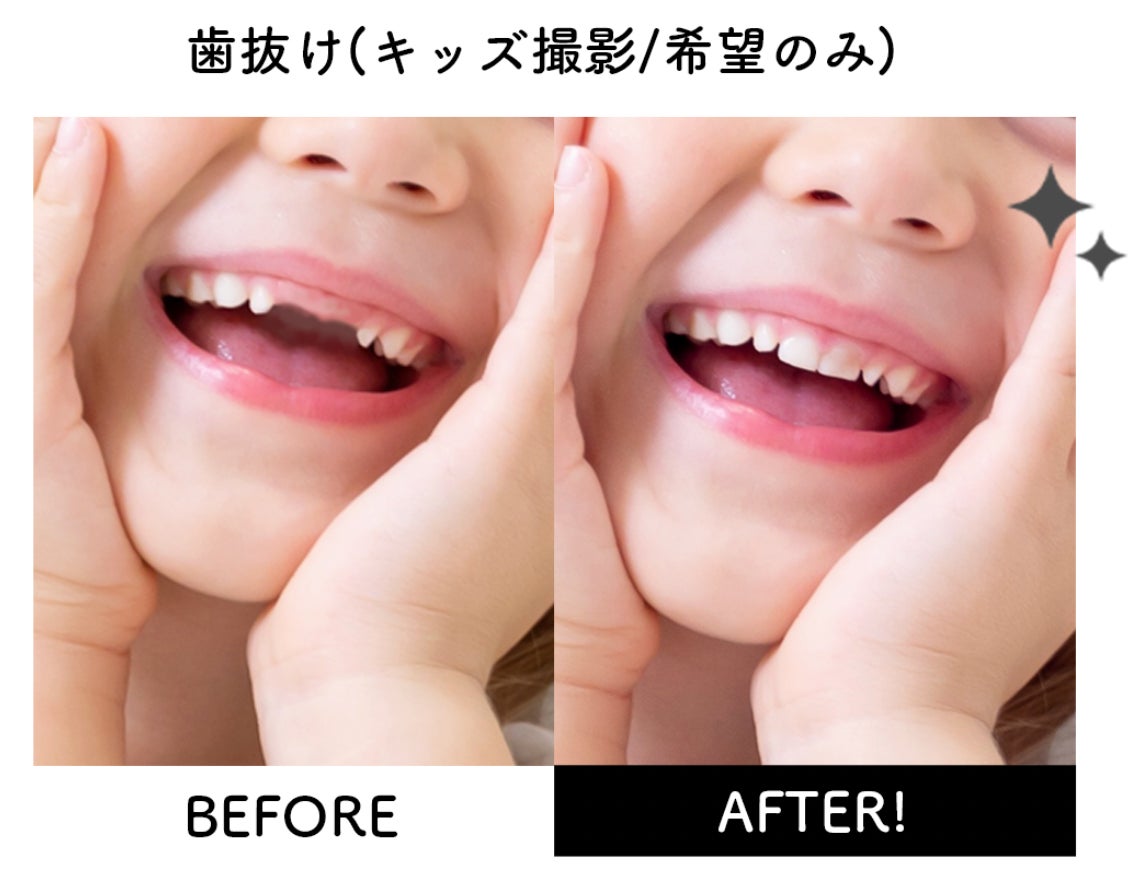お子様の記念写真を撮る直前のタイミングで顔に傷ができてしまったり、歯が抜け替わってしまったり。