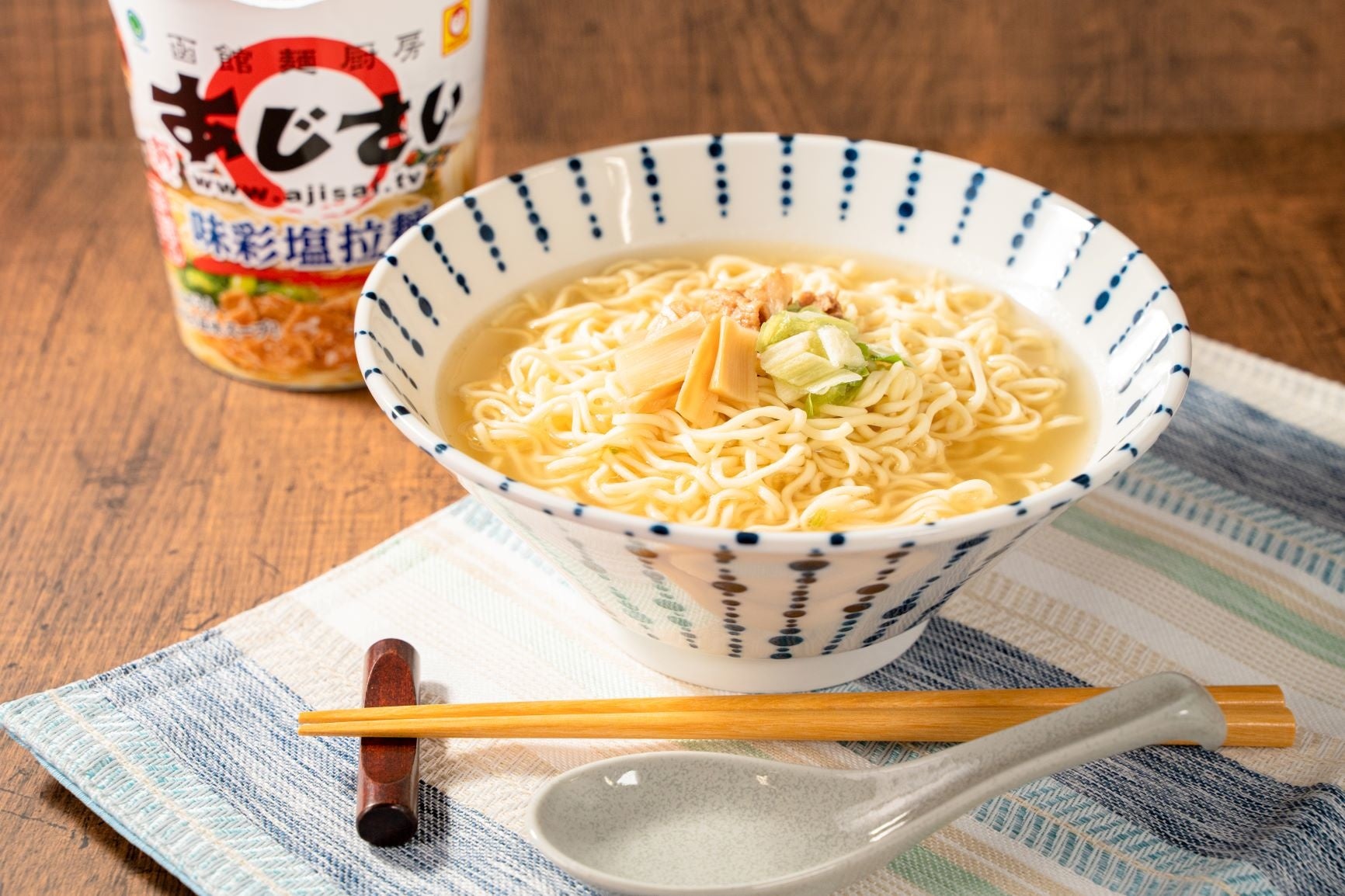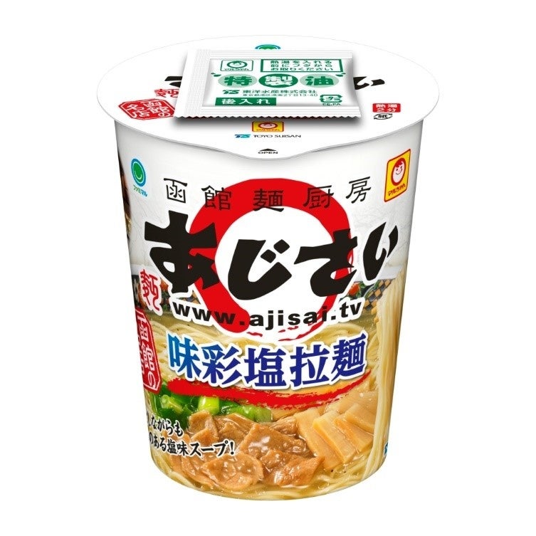 【内容】創業80年以上を誇る北海道・函館の老舗ラーメン店「函館麺厨房 あじさい」の看板メニュー「味彩塩拉麺」をイメージしたカップ麺です。チキンエキスとポークエキスをベースに、魚介や昆布の旨味を加えた塩ラーメンスープと、硬く歯ごたえのある極細麺を合わせました。従来品よりもさらにお店の味に近づけるよう、スープの素となる材料を見直し、クリアな色合いでコクがある味わいに仕上げています。