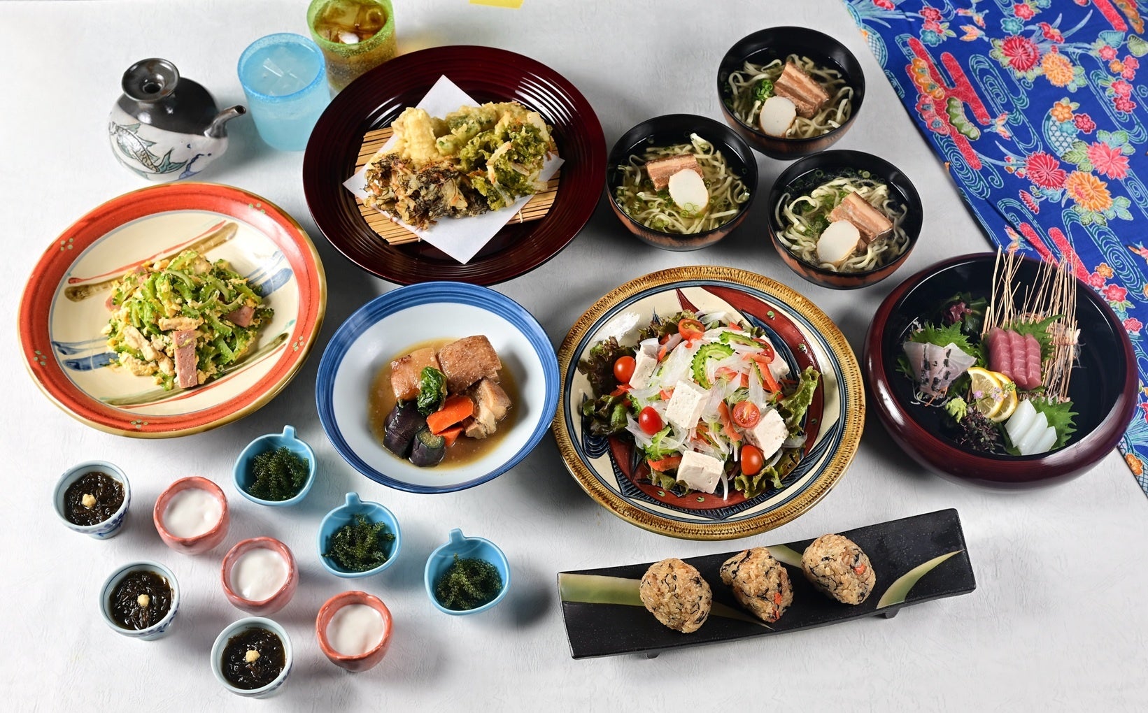 沖縄小鉢2種(もずく酢・ミミガー)/スーチカー炙り焼き/海鮮サラダ海ブドウ添え/ゴーヤーチャンプルー/沖縄そば/ジューシー (沖縄風炊込みご飯) /ブルーシールアイスクリーム