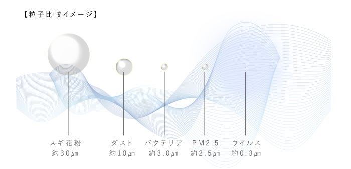 | バクテリア捕集効率 : 99%カット 微粒子捕集効率 : 99%カット ウイルス飛まつ捕集効率 : 99%カット 花粉粒子捕集効率 : 99%カット 【試験機関:一般財団法人カケンテストセンター】 |