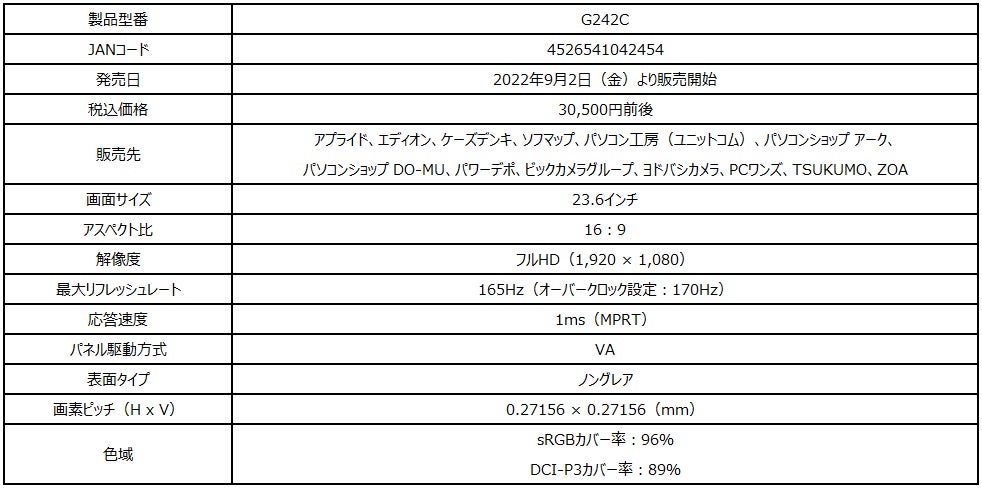 高い没入感が体験可能な23.6インチ湾曲ゲーミングモニター 最大リフレッシュレート170Hz、応答速度1msの高スペックモデル 「G242C」発売