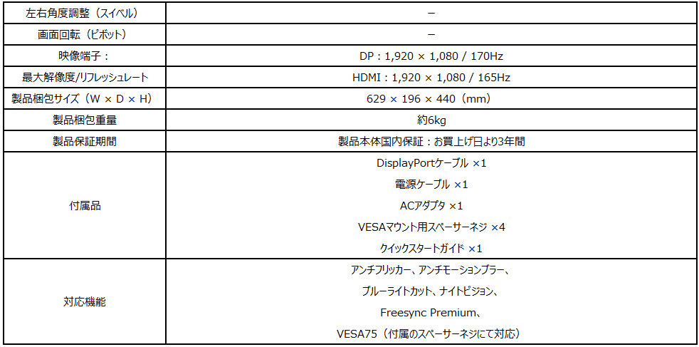 「G242C」はプロゲーマーにも好まれる23.6インチサイズと湾曲率1,500Rの液晶パネルを組み合わせる事で、高い没入感と短い視線移動で画面全体を把握する事ができ、リフレッシュレート170Hz(オーバークロック設定)・応答速度1msの高いスペックで、残像感の少ない映像で快適にゲームプレイを楽しむことが出来ます。また、同期機能としてFreeSync Premium、暗いシーンでも視認性を上げるナイトビジョン、長時間の使用において目の疲労を軽減するアンチフリッカー、ブルーライトカット機能を搭載しております。入力端子はHDMI 2.0b ×2、DisplayPort 1.2a ×1に対応しており、パソコンとゲーム機など複数の機器を接続し、背面のジョイスティックを操作することで簡単に切り替えて使用することができます。さらに、VESA規格にも対応しており、付属のスペーサーネジを使用する事でモニターアームに取り付ける事が可能です。